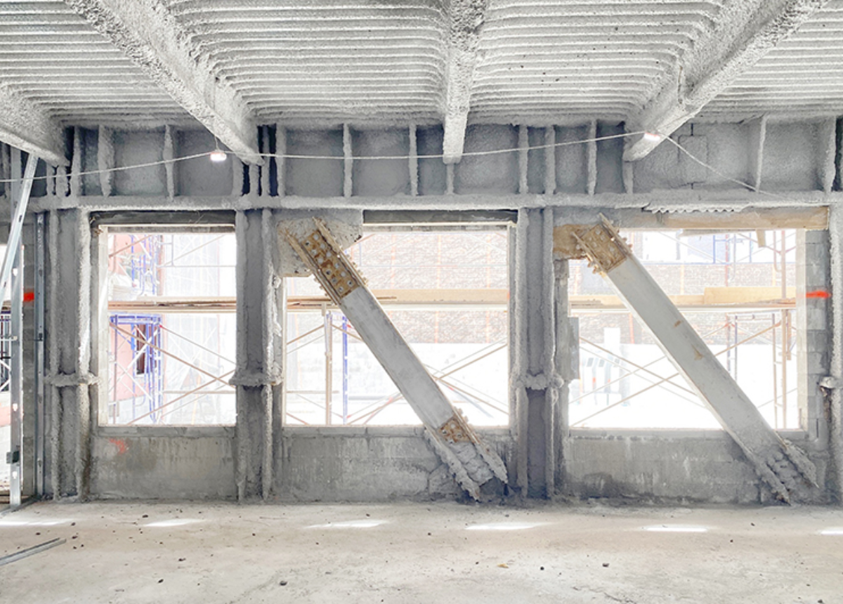 “Creating a large, column-free space in the gym area was the main structural design challenge,” said CityScape Engineering Principal Hadi Djohan, P.E. “We solved it by designing three supersized truss assemblies installed above the gym to support columns and bearing walls for the three levels above the gymnasium. Each truss is one story high and will be hidden inside walls on the third floor, which is immediately above the gym. Bretton Steel fabricated the trusses in Quebec, Canada, in sections up to 391 inches long, each weighing up to 37,000 pounds, to allow for delivery into the construction site to be then assembled into 94-ft.-long truss systems. The steel beams making up the trusses are 36 inches deep. An additional challenge was designing the trusses in a manner that allowed for door and window openings in them to meet the interior layout design.”